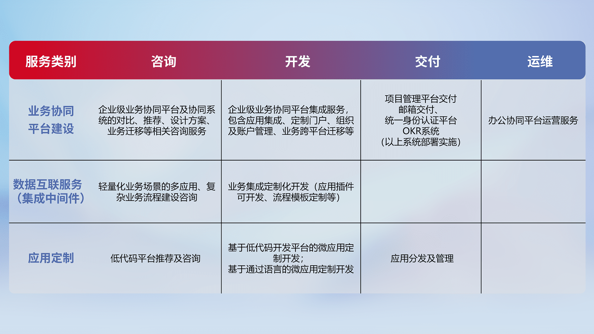 针对钉钉、、、企微、、、、IDaas等平台级产品提供产品的规划、、方案、、交付、、、定制化开发等服务,,,,实现如统一协同办公、、、智能客户服务、、混合会议管理、、、、智能数据查询、、等业务场景,,实现数字化转型。。。。